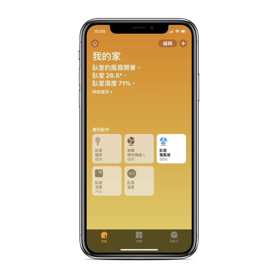 正常來說,這時候不用做任何事,家庭 APP 裡應該就可以看到剛剛加入的家電了,會自動出現,因為是依附在我們一開始所加入的 Homebridge,未來只要在網頁上新增家電配置就會在這裡直接出現。
