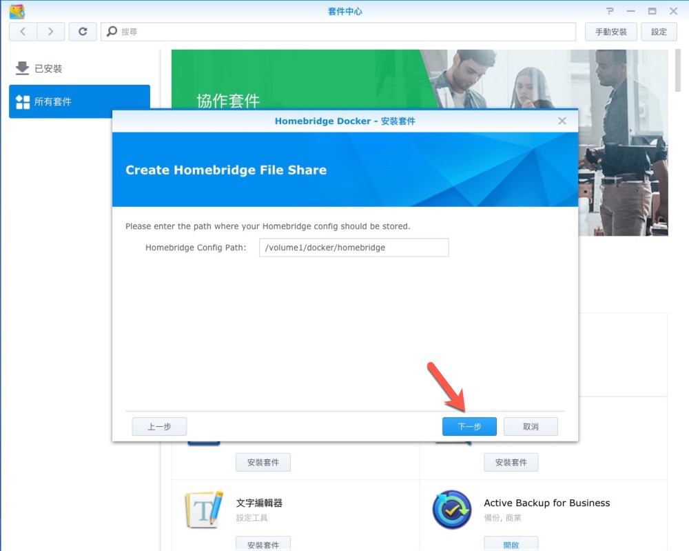 然後在套件中心右上角點擊手動安裝後,選擇我們下載的 SPK 檔案,按下一步進行安裝。