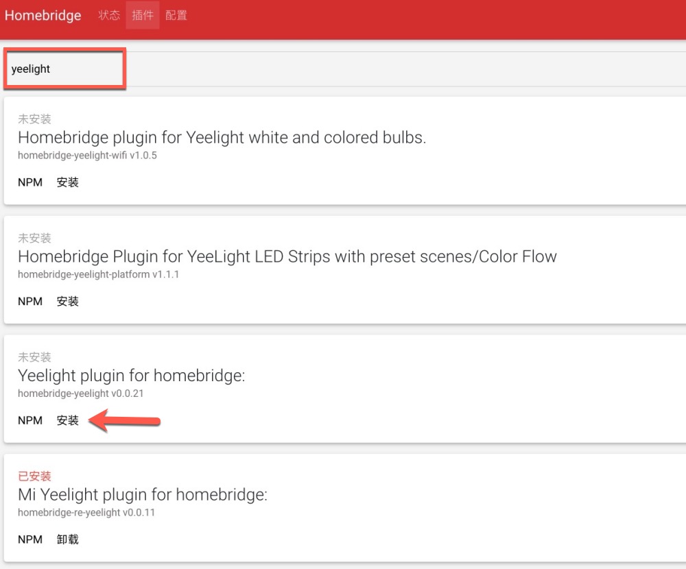 先到插件裡搜尋看看有沒有你想加入的家電,但搜尋時不能單純以小米檯燈這樣搜尋,要想一些英文關鍵字打進去搜看看,至於哪一個一定可以用就得一個個試,還有憑一點經驗選擇,找到後點擊安裝。
