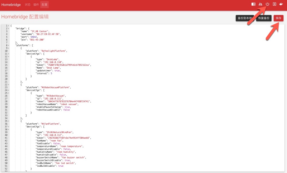 然後回到 Homebridge 按照配置加入後,按右上角保存,再點擊最右上方的重啟按鈕,將 Homebridge 重啟。