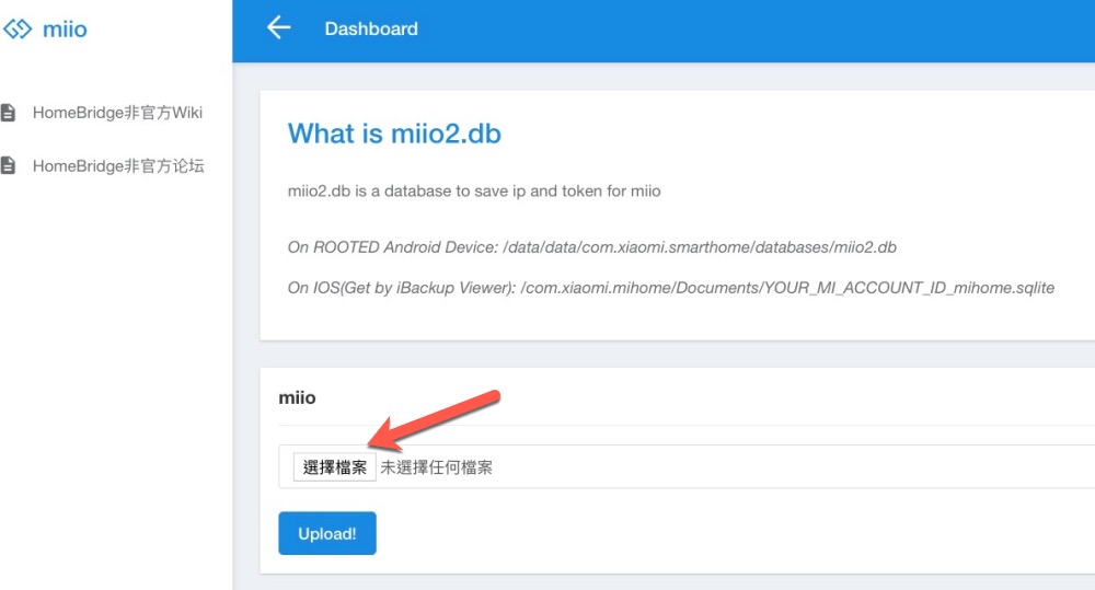 然後到這個 miio 網站,選擇我們取得的 miio2.db 檔案上傳。