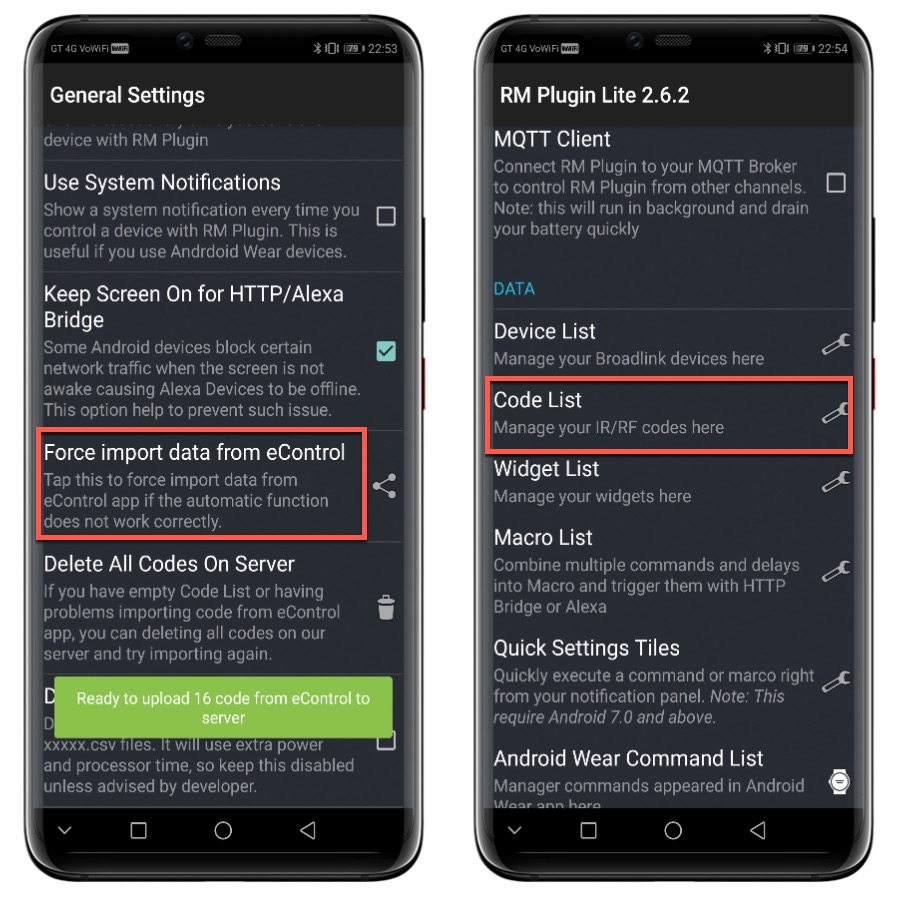 打開 Broadlink RM Plugin Lite 後,將 HTTP Bridge 勾選,並進入 General Settings,再點擊 Force import data from eControl。
