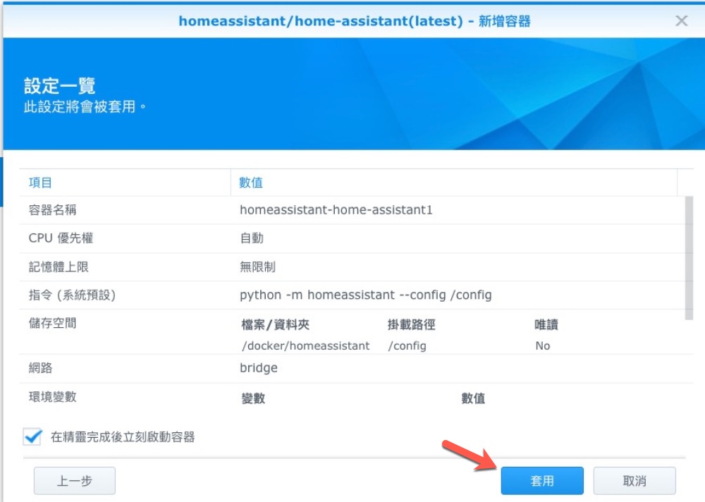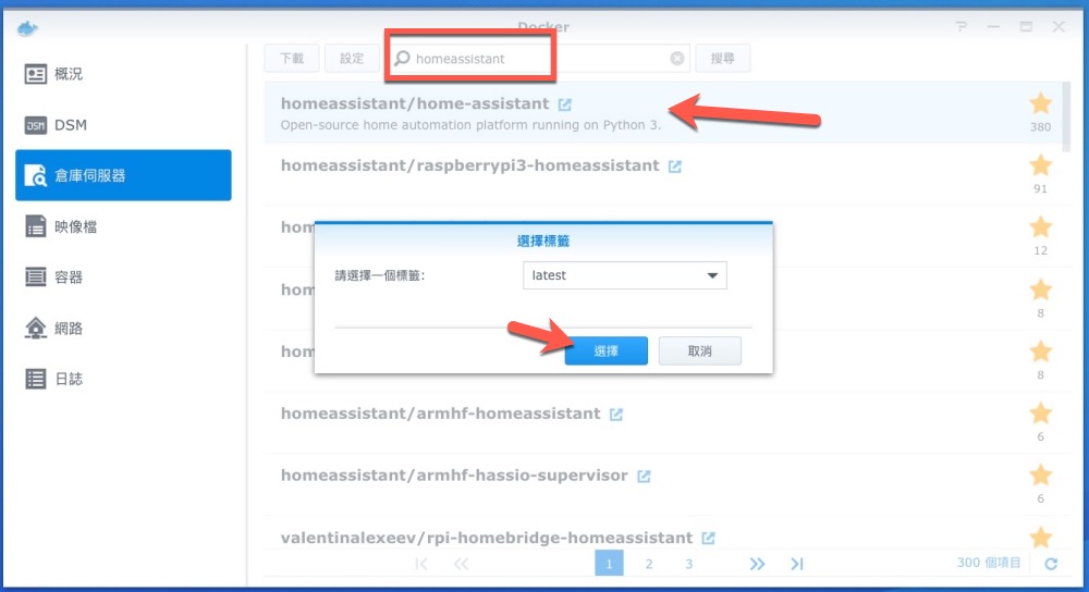 同樣以下教學都是用 Synology NAS 來搭建的,請先按照上面那篇 Homebridge 教學先安裝 Docker 及 Homebridge,接下來同樣在 Docker 裡搜尋 homeassistant,應該就是第一個,雙擊後再選 lastest 選擇。