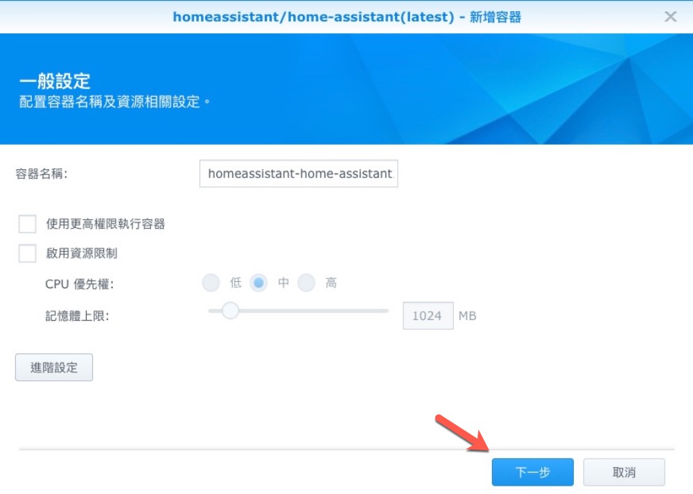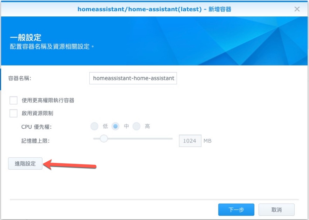 儲存空間請在 nas 裡新建一個資料夾,並掛載路徑設為 /config。
