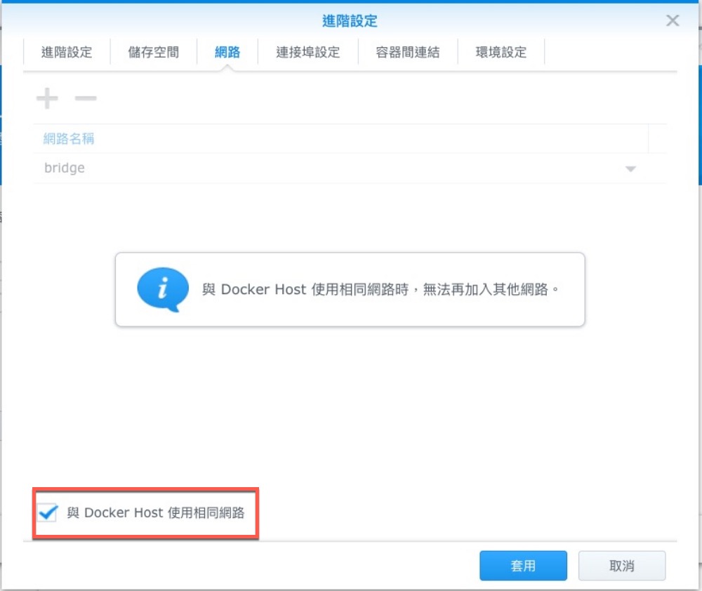 網路中,勾選下方的 Docker Host 使用相同網路。