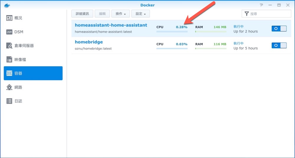 這麼一來就會在容器裡看到 homeassistant 正常運作了,記得 homebridge 也要先建立好。