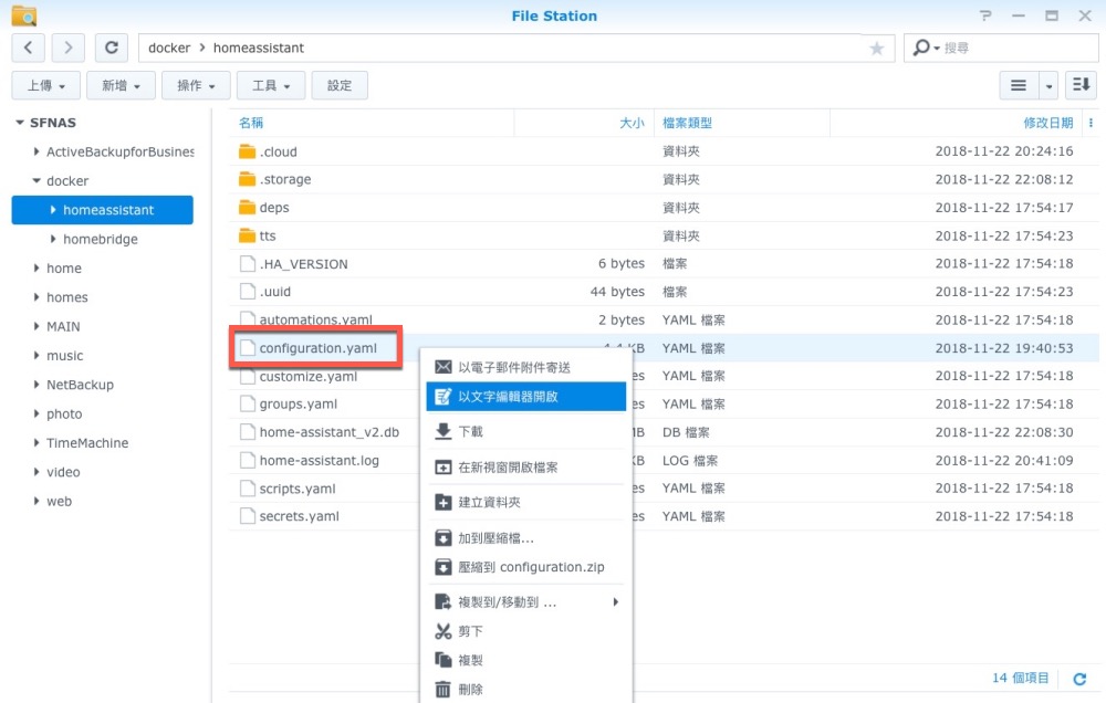 進入 HA 畫面成功後就可以先放著,接下來重點就是要來編輯 configuration.yaml,這個檔案會在前面你建立 HA 時選的資料夾裡,你可以下載編輯後再上傳,或者直接在 Synology 的套件中心先安裝文字編輯器,就可以直接編輯內容。