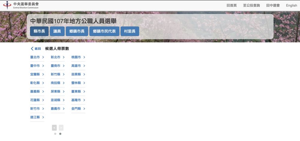 中選會的即時開票網頁上我們可以在「中華民國 107 年地方公職人員選舉」中來選擇縣市長、議員甚至是村里長等公職選擇,接著挑選關心的縣市、行政區來看候選人的得票情況。