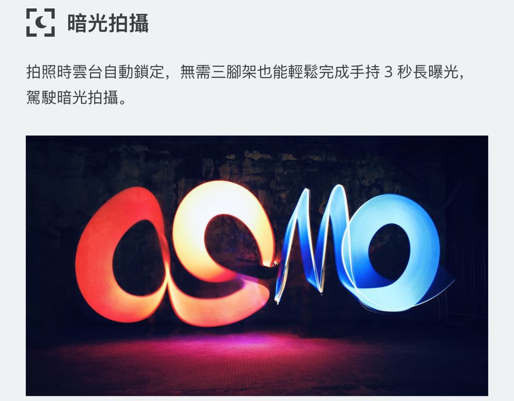 這款輕巧的 Osmo Pocket 可以說是麻雀雖小卻五臟俱全,在功能上具備有可以鎖定目標拍攝的「智能跟隨」、在自拍模式下的「人臉跟隨」、記錄光影變幻的「縮時攝影」、雲台橫滾軸會跟隨用戶手持的角度同步轉動,為影像增穩的同時保留了第一人稱視角的獨特視覺效果的「第一人稱視角模式」、以及能夠選擇 3x3 (拍攝 9 張拼接圖像)或 180 度模式(拍攝 4 張圖片)的「全景模式」讓用戶隨時都能輕鬆地記錄下動感瞬間。
