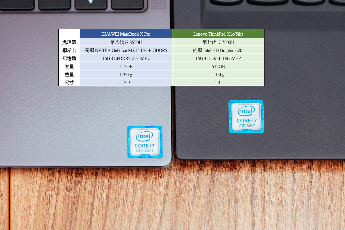 一般挑筆電首要的一定是看規格,但阿湯其實都會先看外型對不對味,不過以 MateBook X Pro 及 ThinkPad X1c 來說,外型我都蠻喜歡的,所以就先來看看規格差異,記憶體跟硬碟的部份沒有太大實質上的差異(速度也是)就先略過,處理器的部份 MateBook X Pro 是採用第八代 i7,而 ThinkPad X1c 是第七代 i7,有人可能會跟阿湯說 X1c 的最新六代機種就已經改採用了第八代 i7 了。