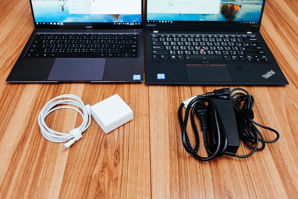 同樣是使用 USB Type-C 電源連接埠來充電,不曉得為什麼 ThinkPad 的變壓器還要設計的跟傳統變壓器沒二樣,其實我們來看看市面上支援 USB Type-C 充電的筆電,變壓器在設計上早就已經都縮小,或者都是像左邊 MateBook X Pro 這樣,一個方形變壓器再加一條 USB Type-C 線材,簡單好攜帶。