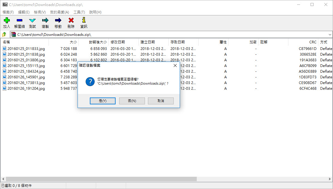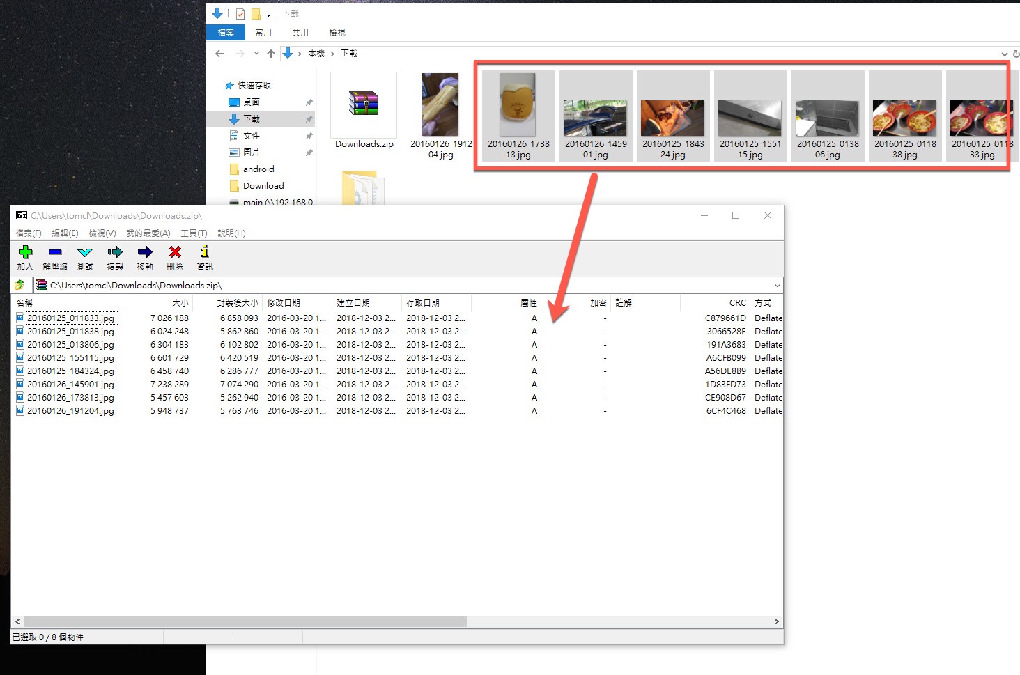 首先,先舉一下例,Downloads.zip 這個壓縮檔案,如果你想將畫面上的其他圖檔加進去,其實不需要解壓縮後再重新打包,往下來看。