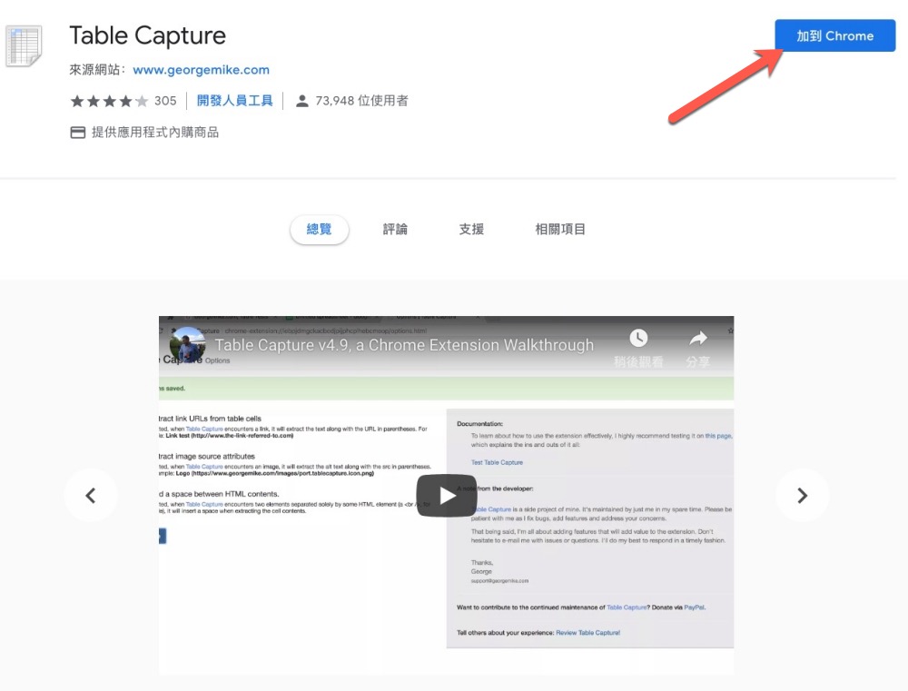 首先進到 Table Capture 這個套件的安裝頁面後,點擊加到 Chrome 就搞定。