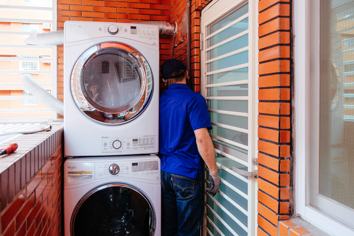 阿湯因為熱水器旁還擺了洗烘衣機二台,其實技師是在狹縫中求生存的幫我拆換熱水器,原本事前在溝通時還以為要先將洗烘衣機移出來,不過因為熱水器原本的安裝架算是很通用,所以只需要將熱水器取下再掛上再配管線就搞定了,不然不移出來的話沒辦法鑽牆啊。