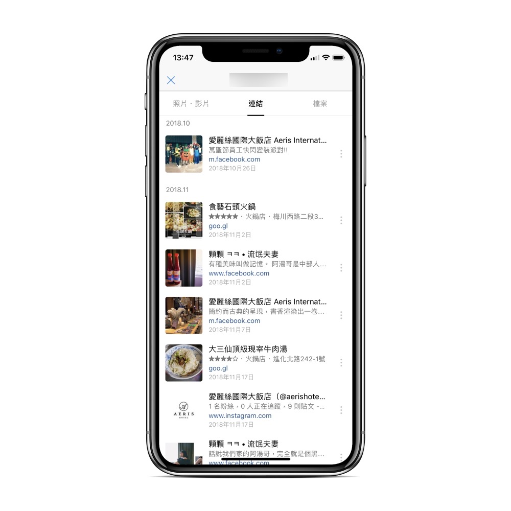 在共享內容裡切分為三個類型,分別是照片/影片、連結、檔案,在這裡我們可以直接查看所有該類別的內容,就不用慢慢的往上滑,而且還以月份區分,不過 LINE 還是一橏,太久的檔案是會失效,大家還是別把可能會重複查看的內容丟在這裡,最好還是用 Dropbox 或是 Google 雲端硬碟這類的服務會比較好。