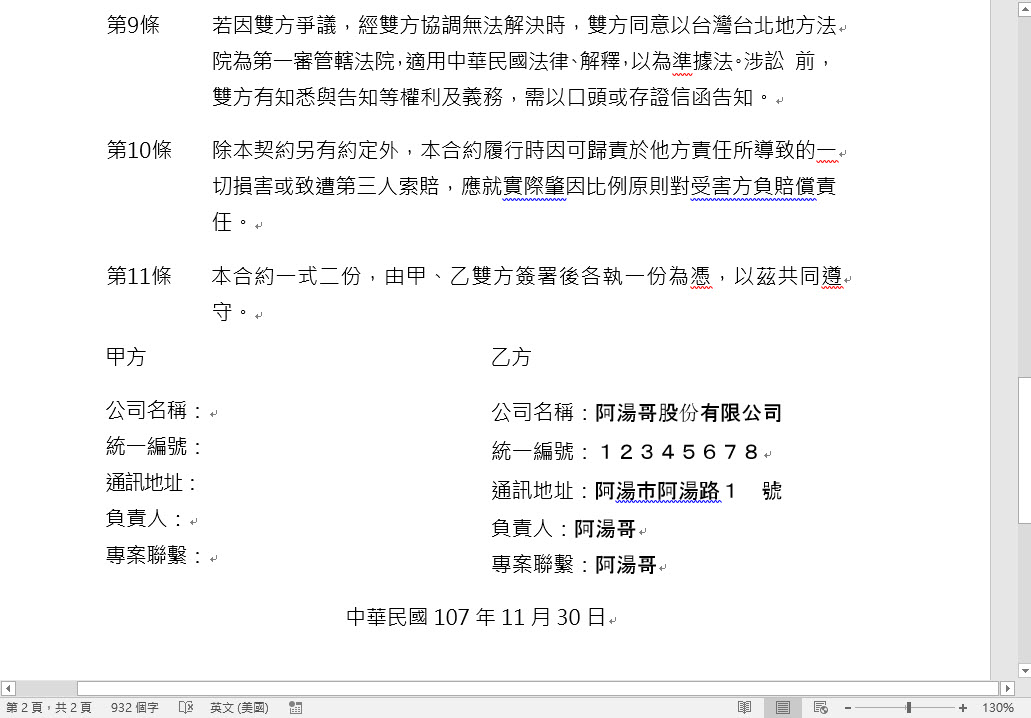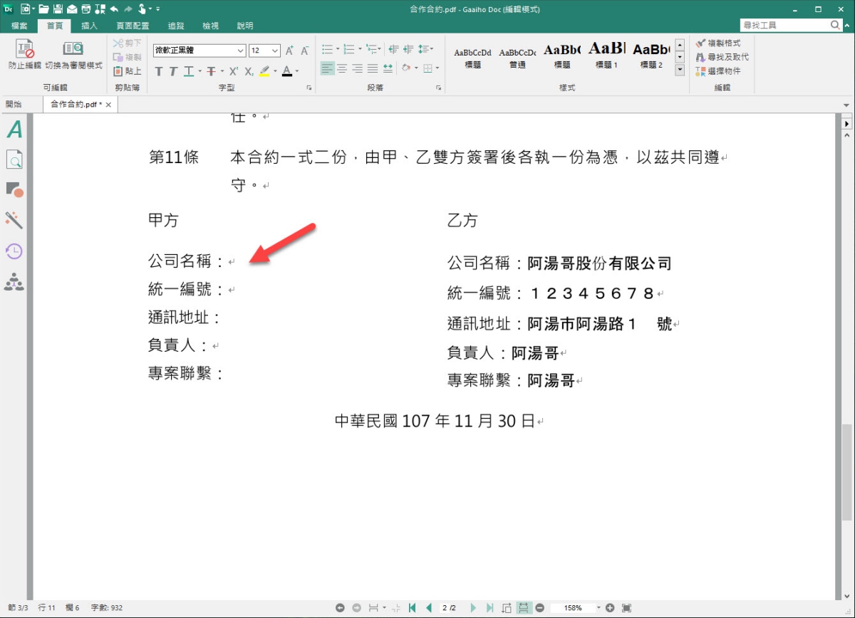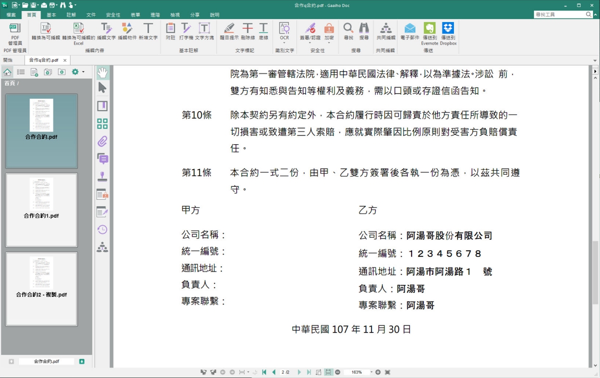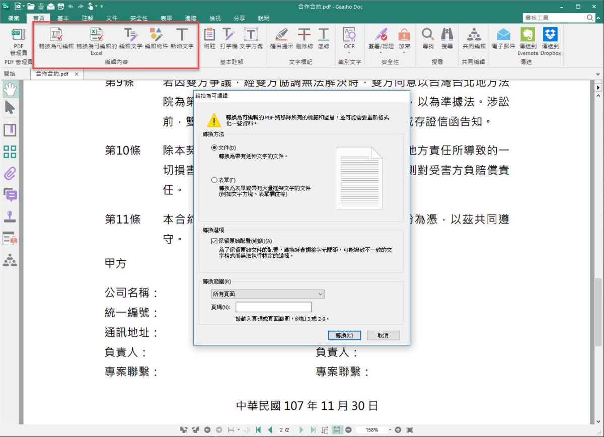 註解功能是非常實用的工具,就跟你在書上想畫重點是一樣的概念,你可以將合約或內容中較重要或需要提醒對方的事項加上醒目提示、對於內容有需要去掉的地方透過刪除線來去除,或是單純的直接取代內容文字等等,其實看到這邊應該就有發現PDF 文電通 5 專業版的介面,做的讓你以為自己是在操作 Word一樣,只要切換到可編輯模式後跟 Word 幾乎無異。