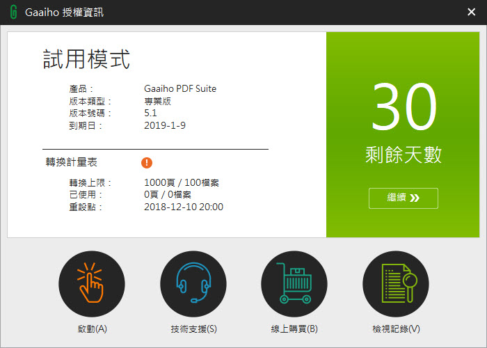 如果你不太確定 PDF 文電通 5 專業版能不能滿足你的需求也不用擔心,軟體本身足足提供了你 30 天的試用期,滿意再買,很多軟體的試用期僅 7 天,其實短期的試用很難發現問題或是無法很確定自己是否適用,30 天算是一個很好的試用期限。
