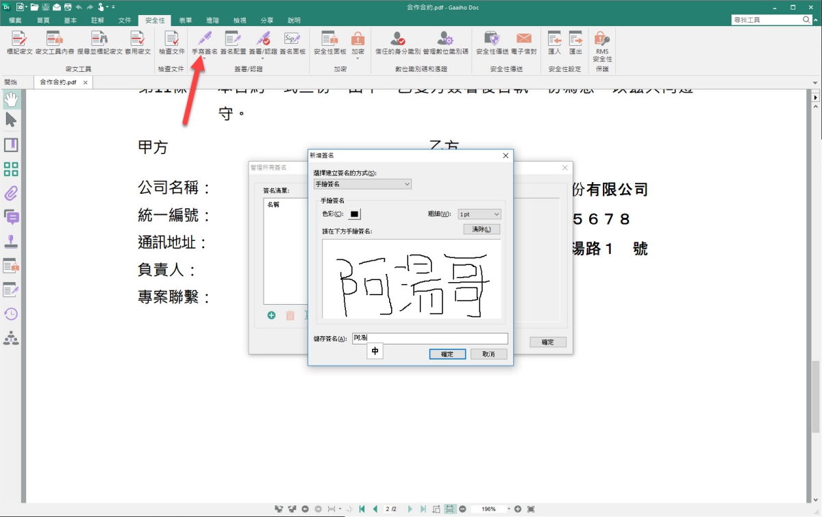 在安全性頁籤裡,有一個阿湯最常用的功能是有關於「簽名」這件事,你可以透過建立不同簽名檔,然後依需求用在簽署不同的文件或內容使用,一次可以建立多個,未來如果文件只需要以電子檔或傳真回傳,那麼用這樣的方式簽名就不需要再次列印出來。