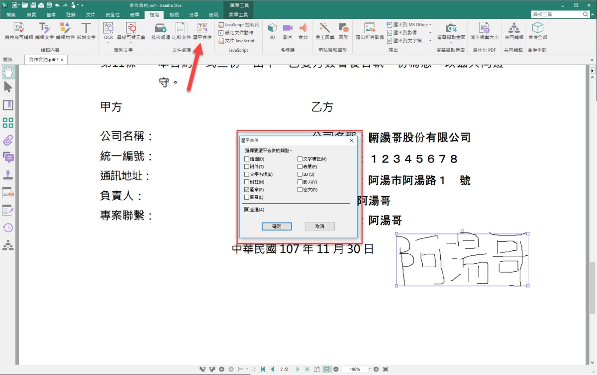 如果有使用到電子簽名的功能,阿湯也建議大家可以在放置好電子簽名檔之後,再點選上方「進階」裡的「壓平合併」功能,然後選擇「圖章」按下確定,這麼一來會將你的電子簽名合併到你的 PDF 上,當別人開啟這個 PDF 時也無法以再編輯的方式移除你的電子簽名哦。