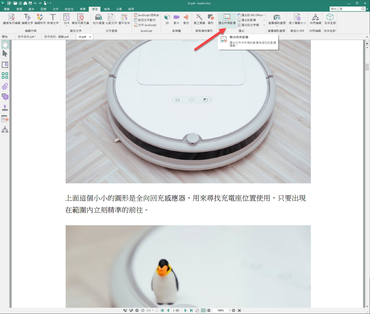 阿湯在把玩 PDF 文電通這個編輯軟體時,也發現了一個很好用的東西,那就是一次匯出 PDF 內所有圖片的功能,只要按一下就可以全部匯出。
