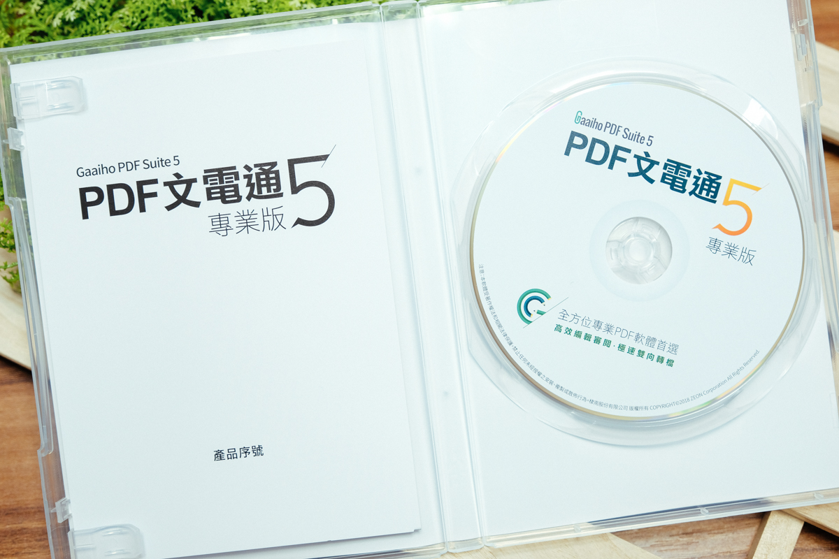 PDF 文電通 5 專業版的盒裝內附有光碟以及「序號」,在安裝軟體時輸入就可以直接啟用授權了。