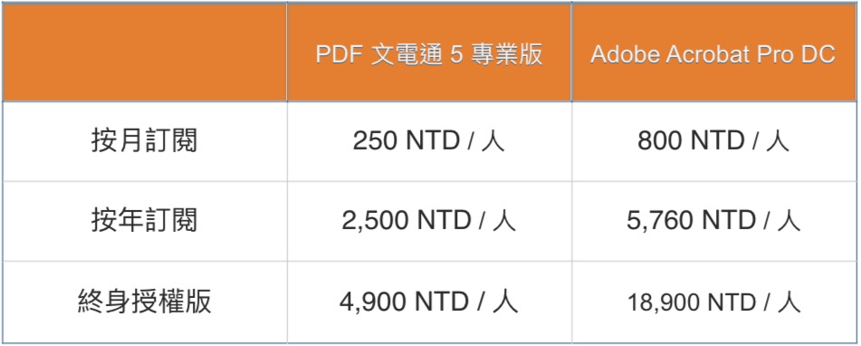 先來說說這二款專業級的 PDF 編輯軟體,為什麼阿湯選用 PDF 文電通 5 專業版?先撇除功能不講,其實光是價格就差相當多,阿湯簡單的列出幾項,如果以按月訂閱來說就有 3 倍以上價差,按年訂閱也有超過 2 倍以上價差,更不用說終身授權版了,而且 Adobe 終授權版好像只有 2017 版本,Adobe 現在新功能幾乎只屬於雲端訂閱版本了。
