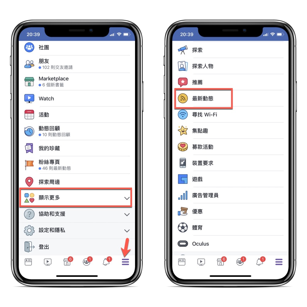 手機版的部份,先進入最右下角的選單中,然後點開「顯示更多」,就可以找到「最新動態」囉。