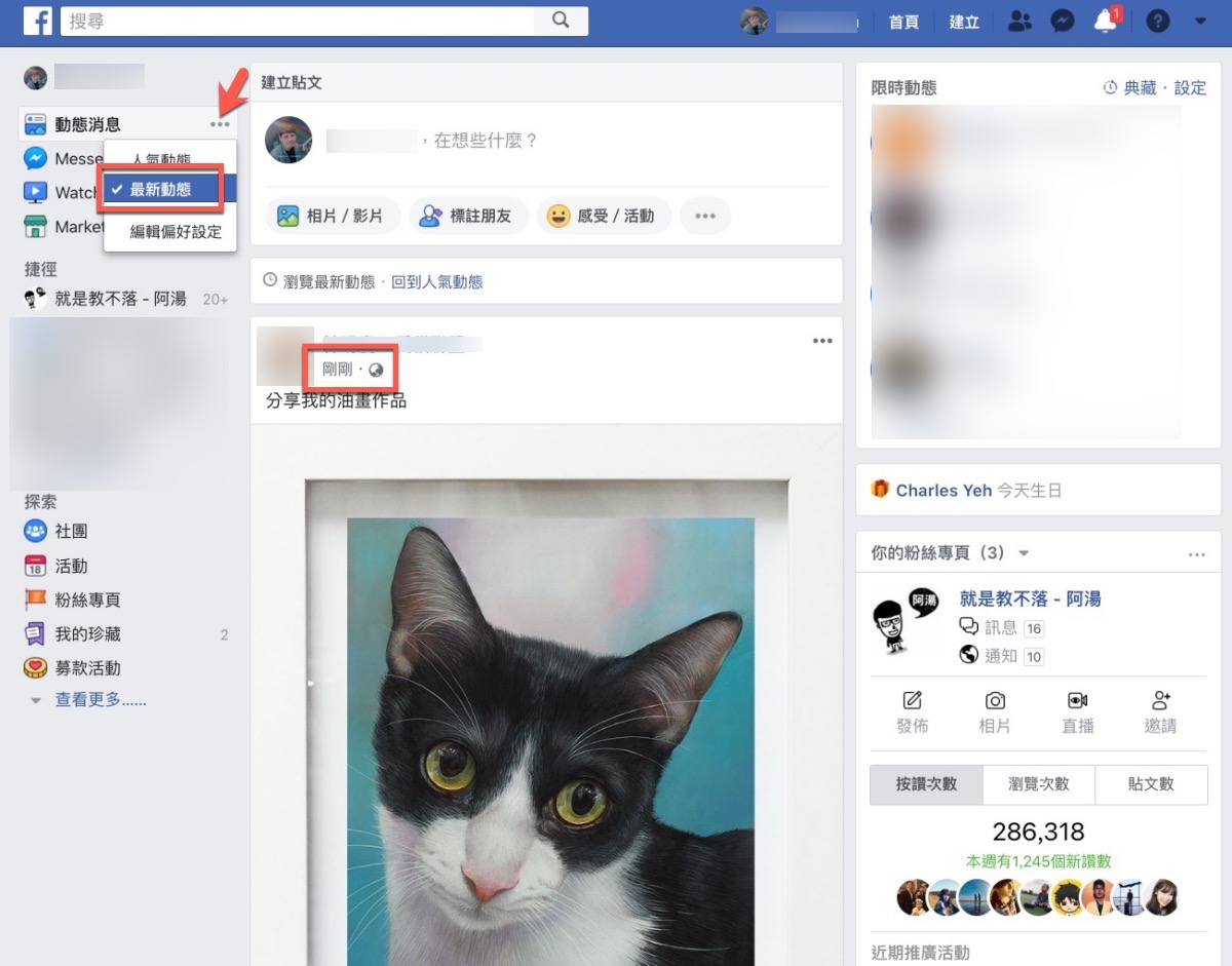 首先是電腦網頁版,非常的簡單,只要在左上角的「動態消息」尾把那三個點按一下,再選擇「最新動態」就可以了,這麼一來就會從最新的開始看囉。