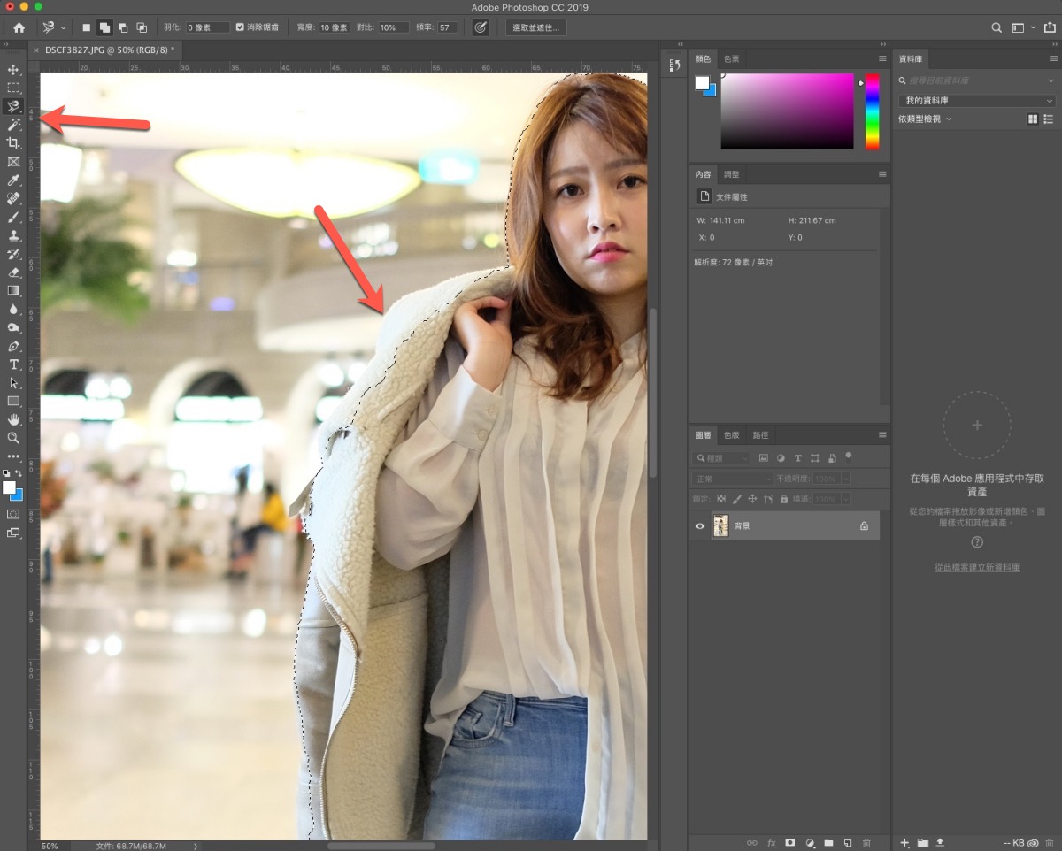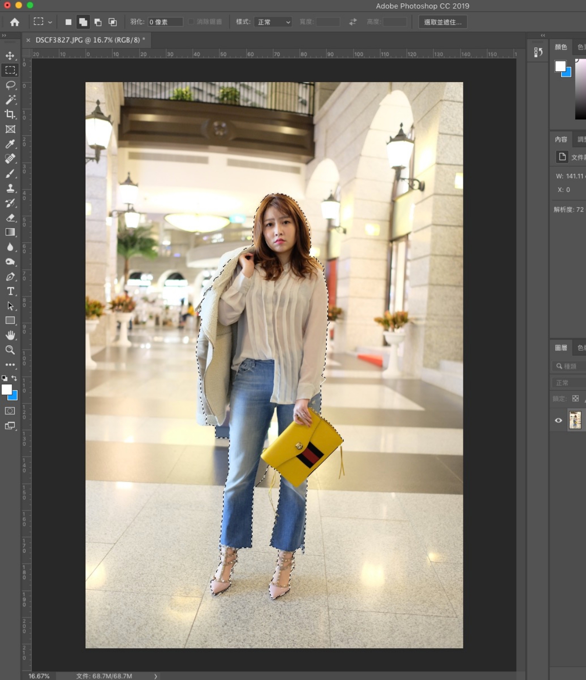 接下來就會看到畫面中的人像已經有 9 成的自動選取完畢了,以簡易去背來說,這樣的選取範圍已經是堪用的程度了。