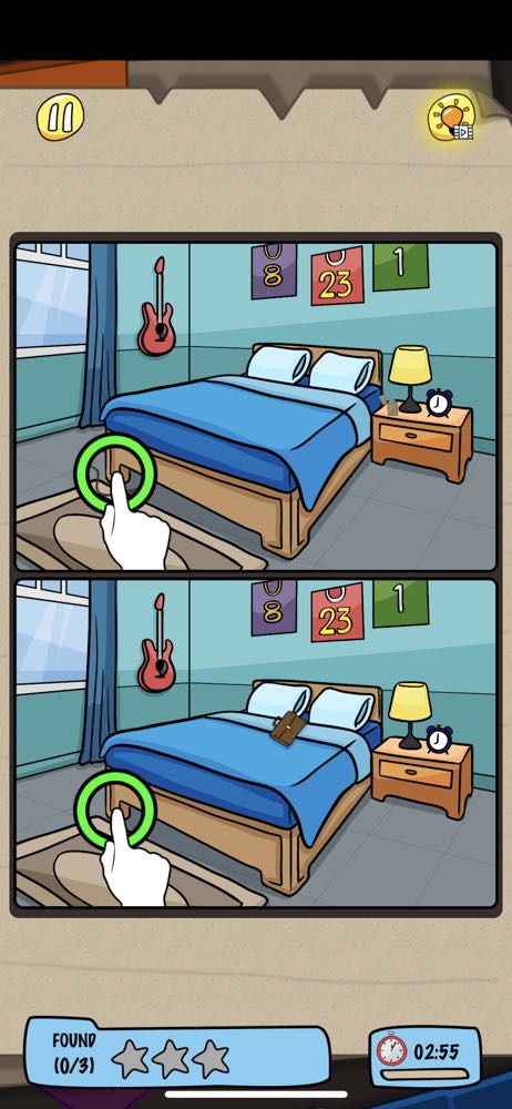 玩的過程中如果找不到,還能點選右上方的燈泡提示,從這遊戲的畫風、主題來說《 Find Differences: Her Secret 》可以說是大人版本的觀察力訓練遊戲,如果本身也是喜歡玩這類解謎遊戲的朋友,也能來幫主人翁一起找找他妻子的外遇證據吧!
