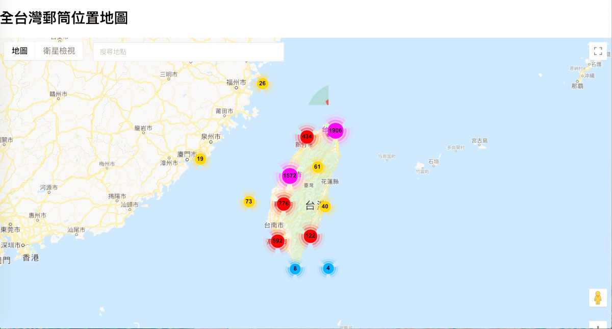 開啟地圖後可以看到全台灣的郵筒分佈狀況,連離島資訊都有,相當的完整,至於使用方式有二種,一種是直接依區域一直點擊進去。