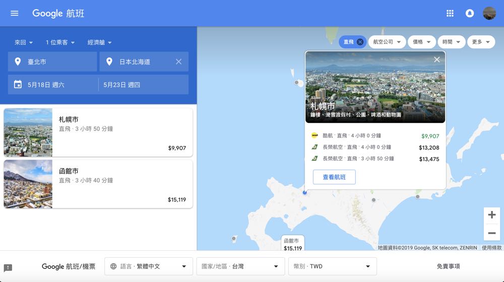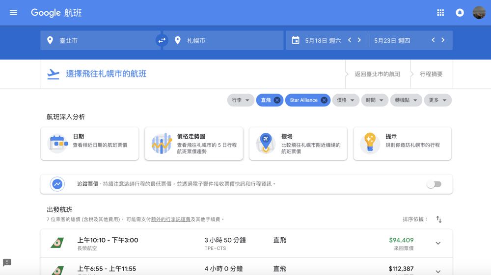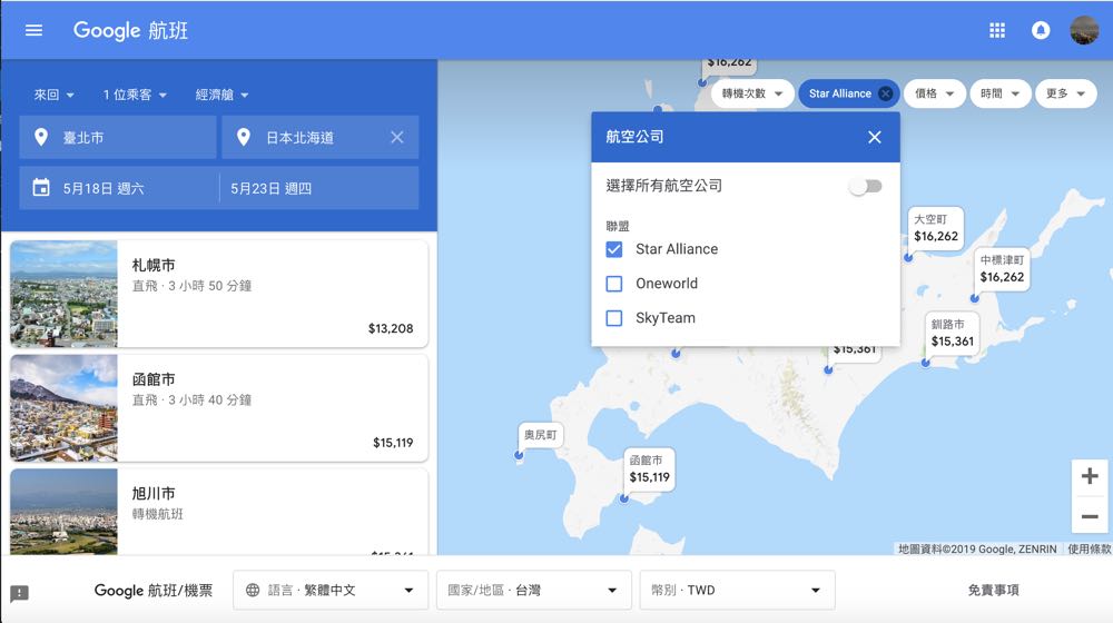 選擇好目的地與時間後,「Google 航班」接著會顯示該地方的各種票價以及能夠進一步篩選的條件,包括轉機次數、航空公司、價格區間、出發時間與飛行時間、分段購票等。最貼心的應該就是「航空公司」的選擇中,竟還列出各種飛行聯盟來讓大家過濾選擇!