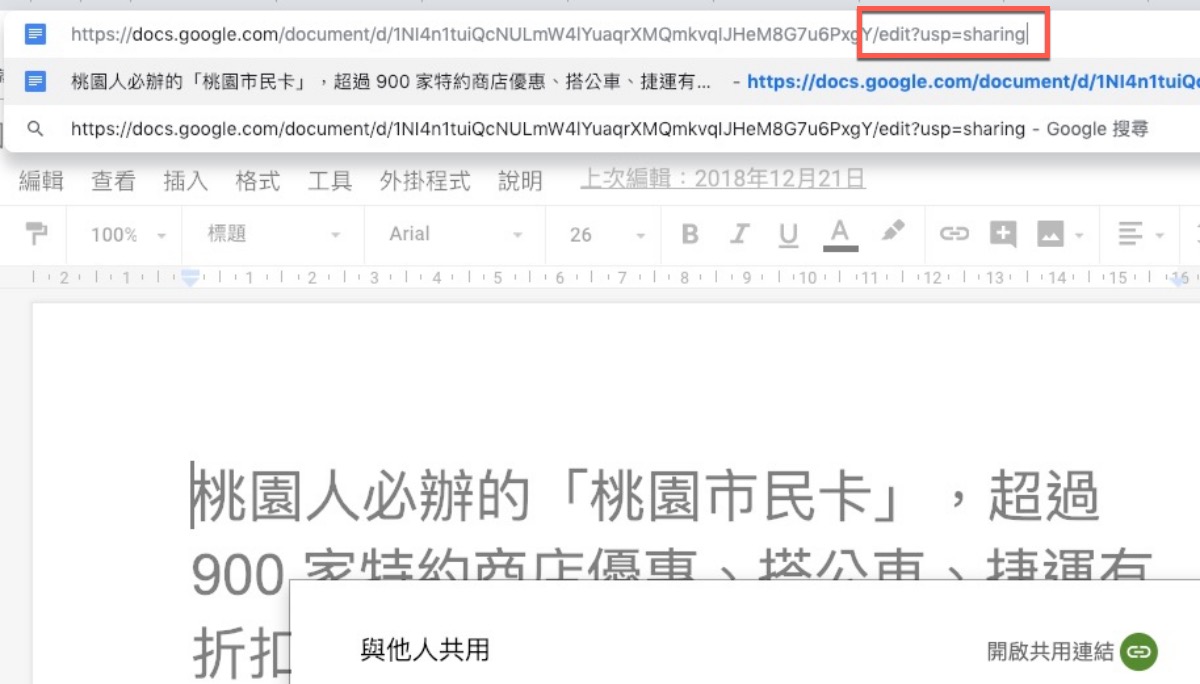 首先我們照正常的共享檔案流程,先點擊右上角的共用後,再點擊「開啟共用連結」,接下來就會獲得一串分享連結,一般我們就是分享這一串連結給別人,不過直接分享就是給別人文件檔案,我們可以稍微修改一下連結,讓別人點擊是直接下載為 PDF,往下來看。