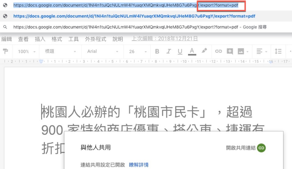 修改為「export?format=pdf」,然後就可以提供修改後的連結別人了。