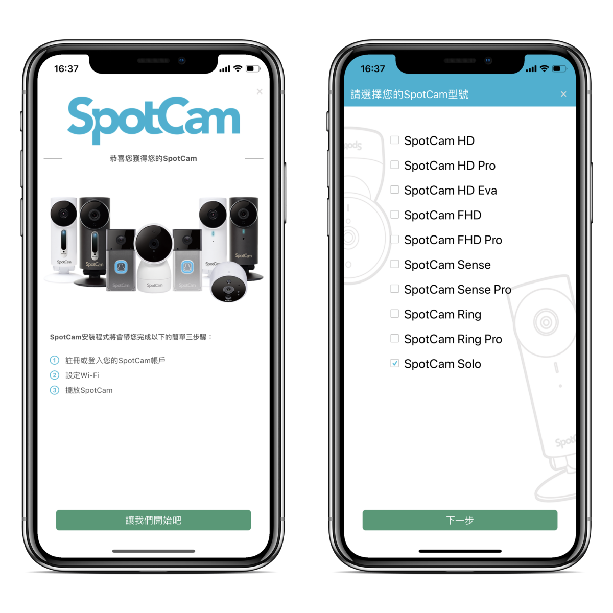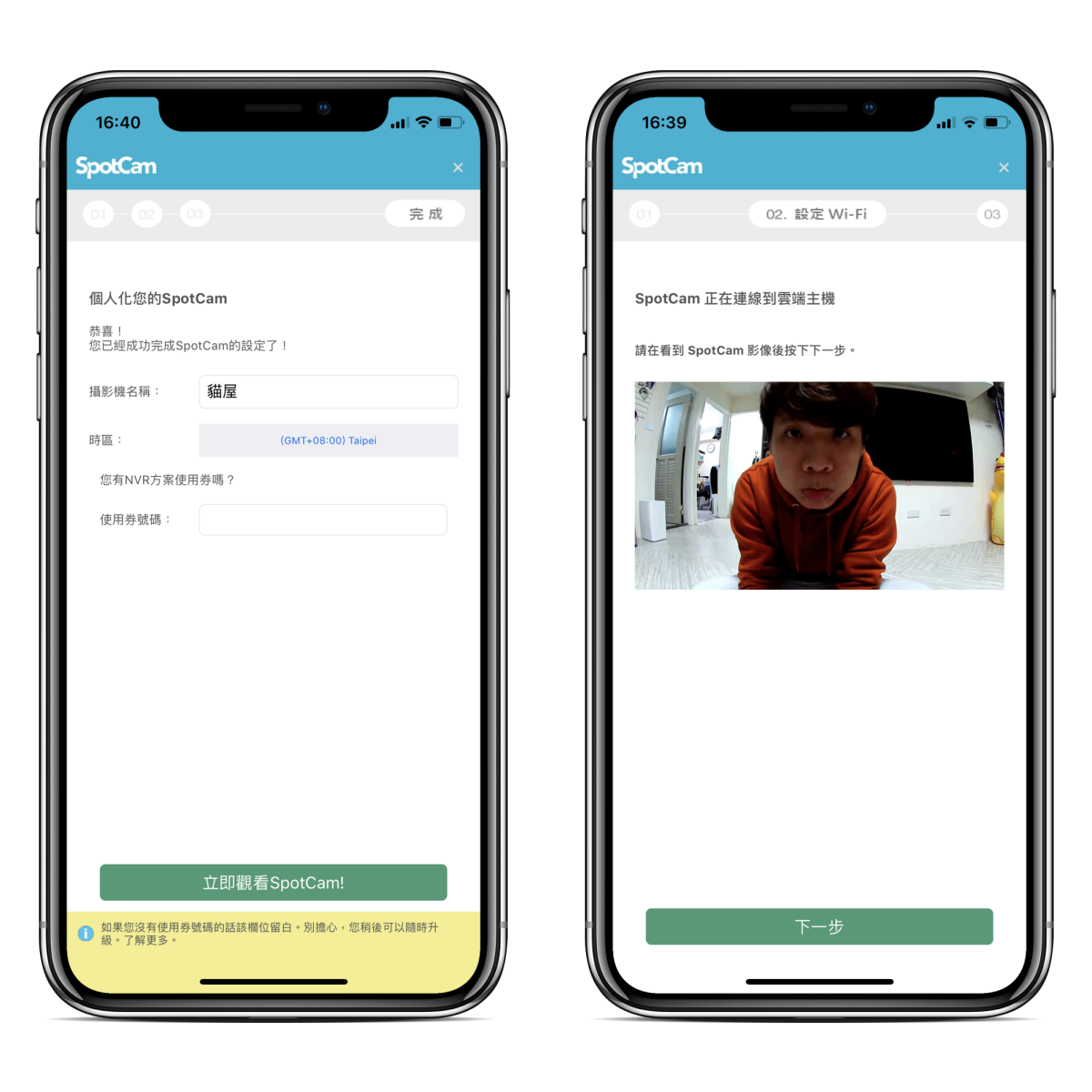 初次使用可以透過 APP 來設定連線及相關警告通知、排程關機等,下載 SpotCam APP 後就可以依照提示進行設定。