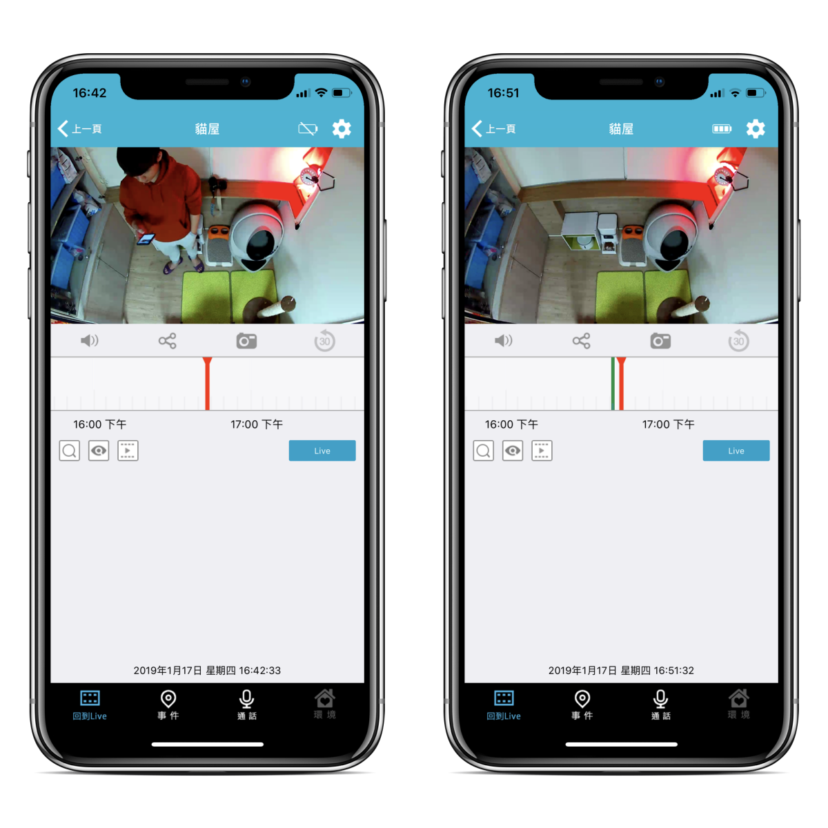 在時間進度條裡,看到綠色一條一條的部份,就是偵測到動靜時錄影的畫面,當你有啟用動態警報的話,每次偵測到就會啟動錄影幫你記錄(可選擇觸發後錄影 10 秒、20 秒或 30 秒)。
