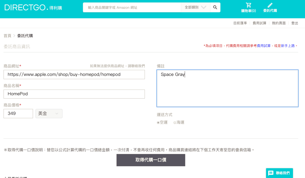 委託代購的表單一次填一個商品,如果你有多樣商品要代購,就重複填單,這邊只需要填入商品網址、名稱跟網頁上的金額,如果有規格上的不同,可以在備註欄位填寫,最後再選擇運送方式,如果你想早點收到就是選空運,阿湯從填代購單到實際收到商品約 12 天(空運),海運則是會需要 6 週以上,不過如果是想買大型家俱,建議走海運,光是運費會差很多。