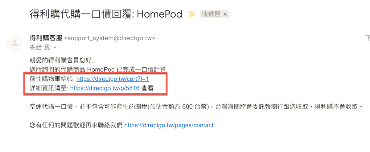 對了,當你送出代購申請後,一般來說都會在 24 小時內收到回覆,阿湯是當天填單當天收到報價,速度非常快,而且價格就是送貨到府全包的價格(海關稅金等都包在裡面,不會再有額外的費用)。