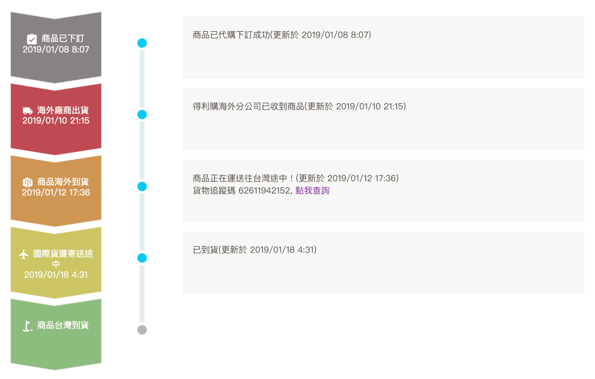 購買的進度也都一目瞭然,透過網頁就能掌握目前商品的進度,不用和代購的來來回回確認,連物流追蹤碼都會提供給你。