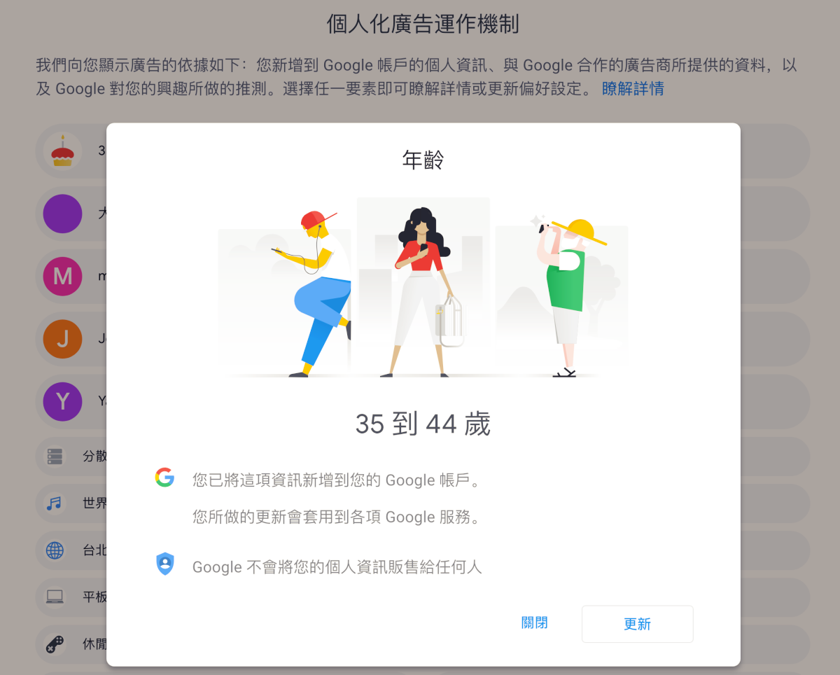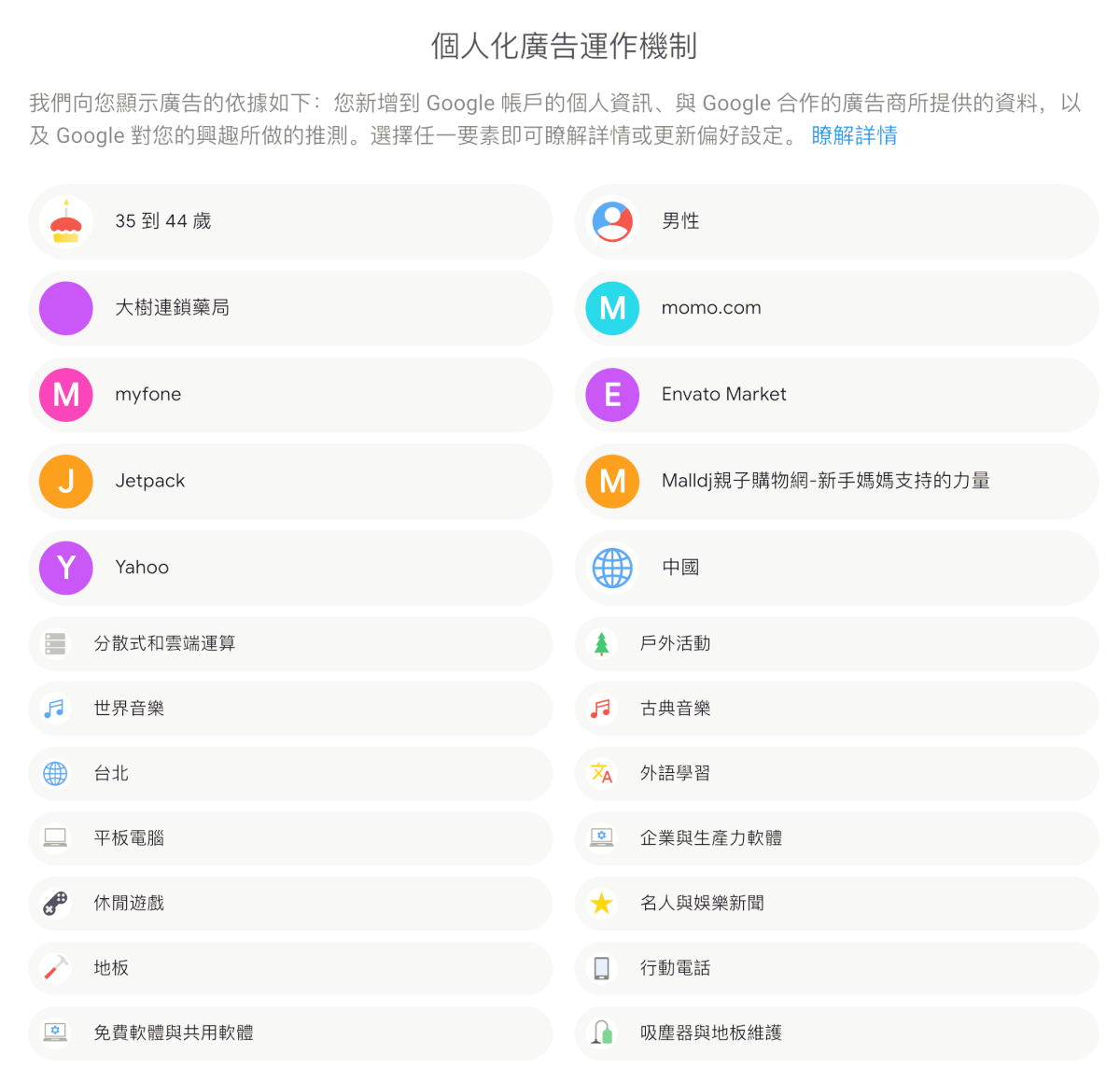 往下滑之後,會看到個人化廣告運作機制,這邊會有你的年齡區間跟性別,然後再往下都是你曾到達的網站、搜尋過的內容等所自動產生的關聯內容詞。