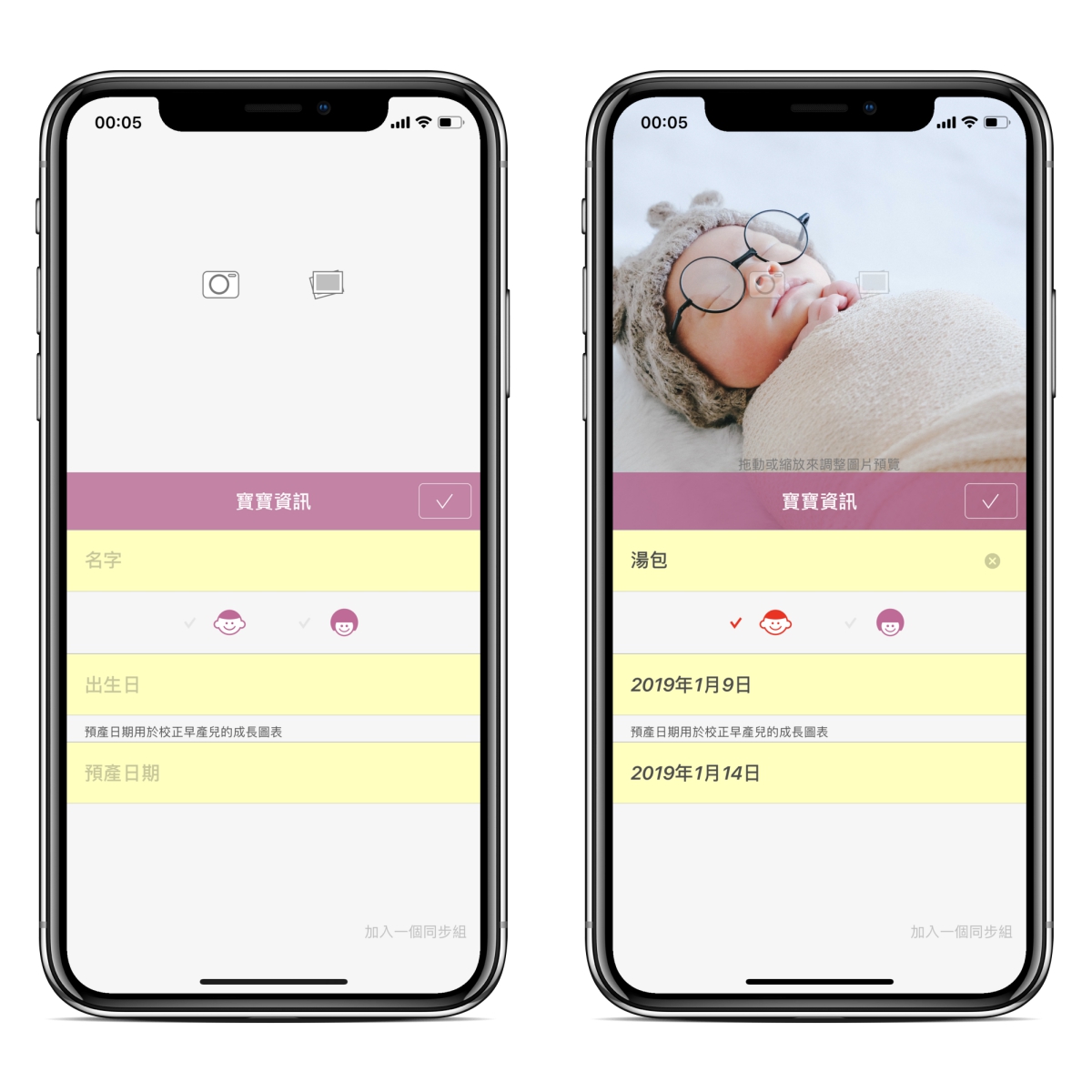 APP 初始設定可以選擇寶寶的照片、生日及性別。