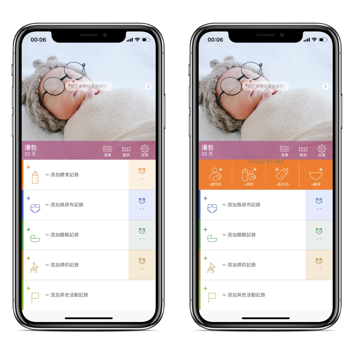 接下來就可以直接使用了,這 APP 其實不太需要阿湯教你怎麼用,因為都是繁體中文,基本記錄包括餵食、換尿布(大小便)、睡眠以及媽媽專用的擠奶記錄,以餵食來說,可以新增的很細,像是餵母乳(親餵)、擠奶(瓶餵)、配方奶或是大一點的時候的副食品,通通都能分開記錄。