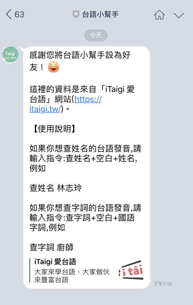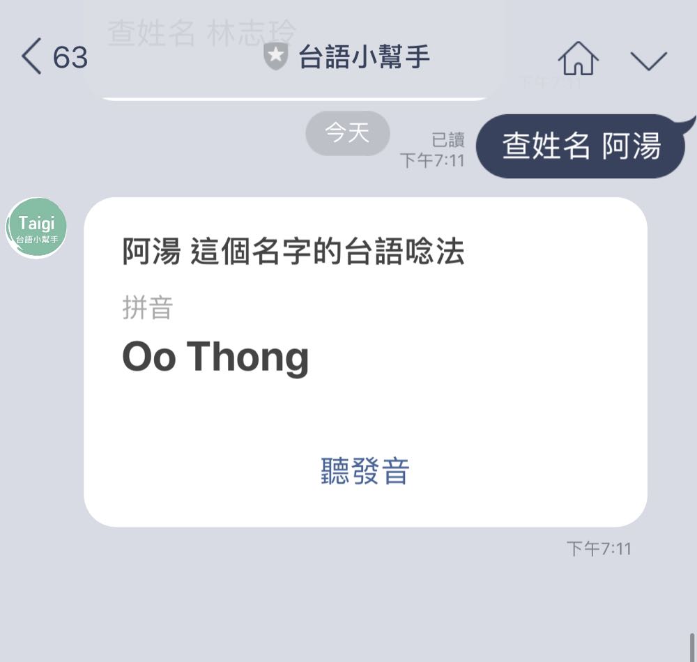 這款「國語小幫手」兄弟的「台語小幫手」資料來自 iTaigi 愛台語,主要提供了「查姓名」與「查字詞」兩大部分,查詢的方法也是 "下指令 空白 要查的字“,例如如果想要查詢阿湯的名字台語怎麼念,就輸入「查姓名(空白)阿湯」,想要查火車的台語怎麼念就是「查字詞(空白)火車」這樣。