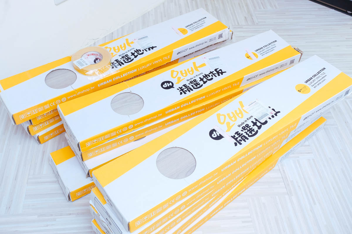 阿湯先量測好家中的客廳坪數後,詢問了 dHSHOP 的客服後,7.5 坪預估要 12 箱,為避免有失誤或修邊需要用到,所以多買了一箱備用,共訂了 13 箱英倫灰橡的歐巴地板來自己 DIY,會選擇這家其實是有原因的,首先是 Facebook 廣告一直出現在我的塗鴉牆,其次是阿湯觀望了很久,這地板主打不需要用膠,可以直接裁切施工,所以自己 DIY 方便很多,最後則是目前還在特價優惠中壓倒了最後一根稻草,還記得之前家裡裝潢時,地板剛弄完都會有部份縫隙溢出膠來,光是清潔花了不少時間啊。