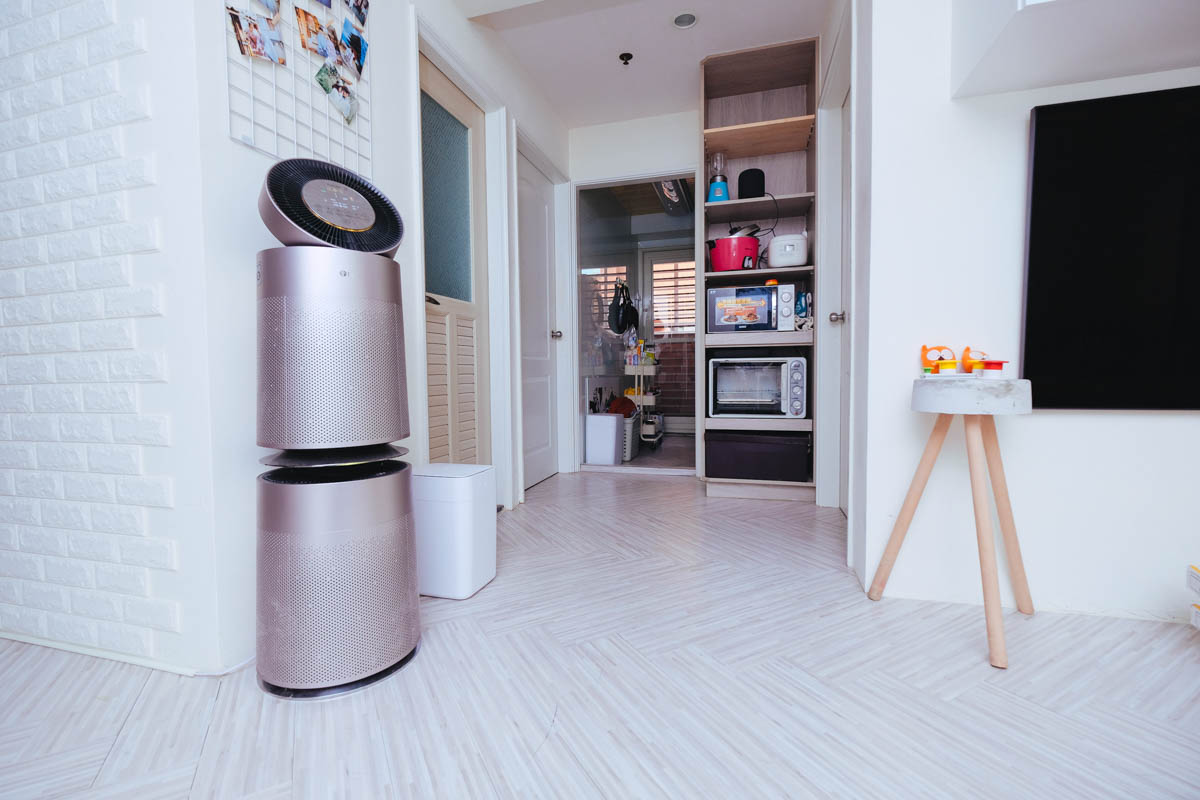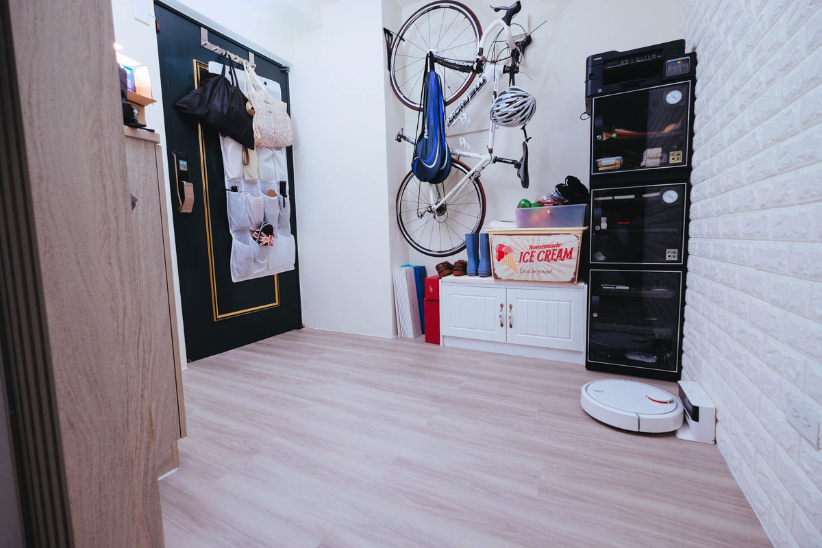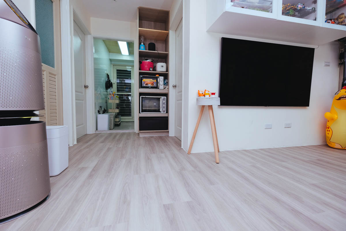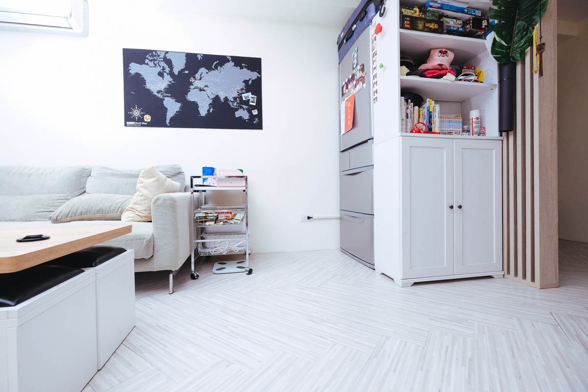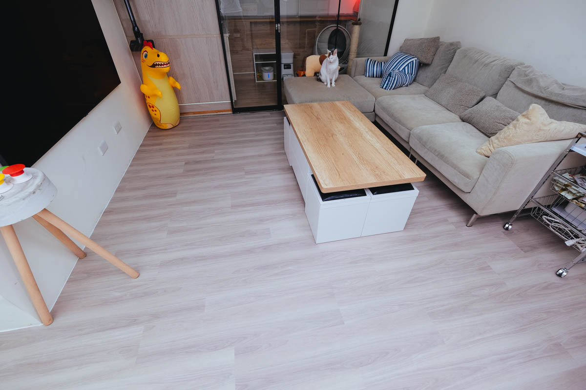 我們家是二房一廳,臥房因為還有床架,重鋪很麻煩,書房攝影工具太多,且湯包之後也不會爬到那(門會關著),所以最後決定就來處理以後湯包最會活動的客廳整個區域,大約是 7.5 坪左右。