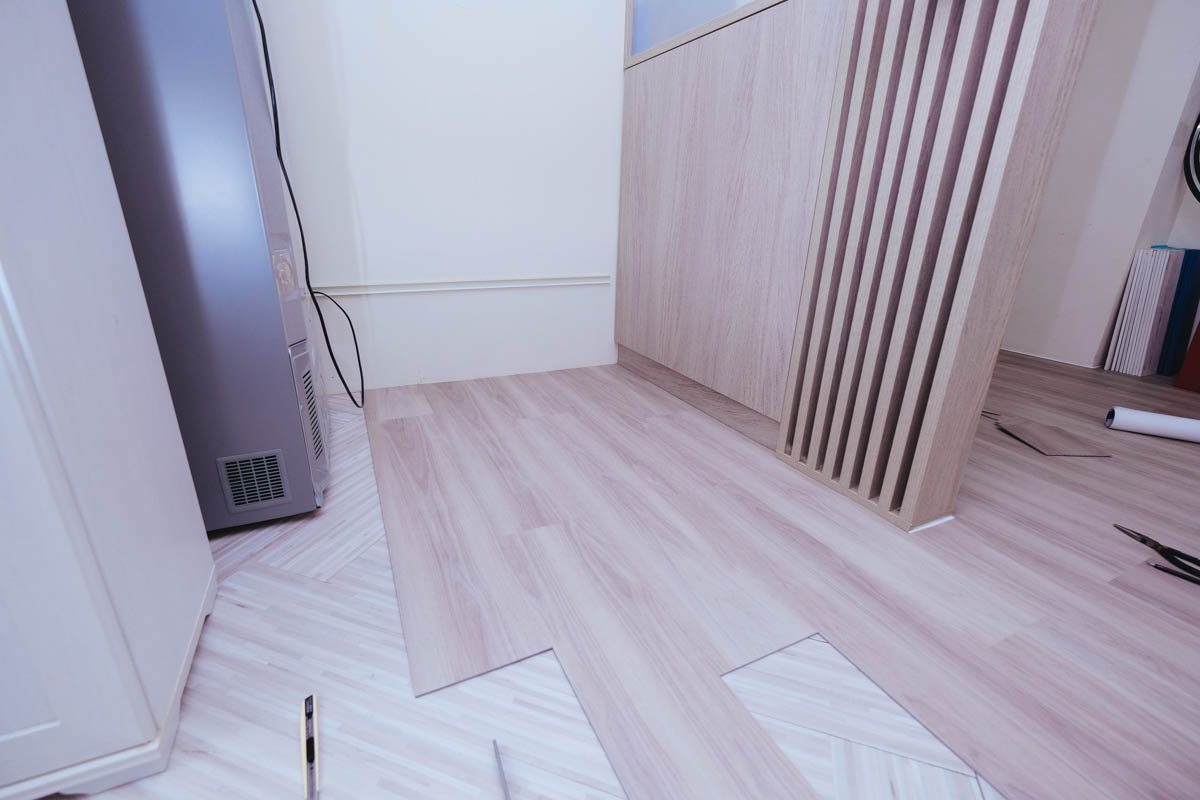 阿湯決定就從最麻煩的前半段區域開始鋪設,也就是玄關到冰箱的區域,為了完善的鋪設地板,所以把東西全清空後,先打掃後就動工了。