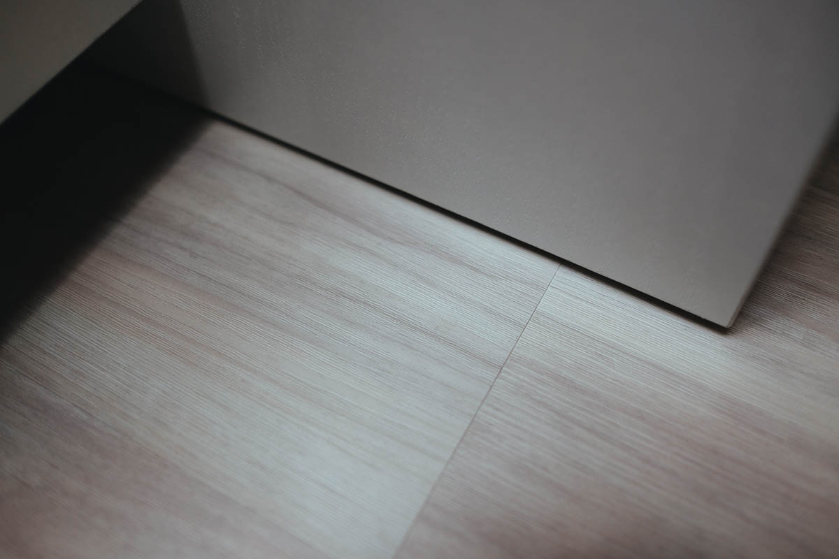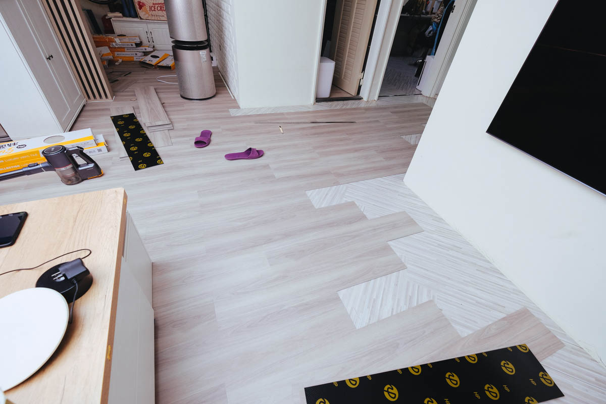 鋪設完後大家應該最關心的是 dHSHOP 的歐巴地板究竟好不好用?先講講鋪設心得,我之前也有自己用過要上膠的超耐磨地板,裁切的部份我個人覺得歐巴地板較為省力且好切一些,鋪設的時候只要確認每一片都有緊密的貼齊,基本上水也幾乎不會往下滲透,雖然阿湯花了八個半小時鋪設,不過扣掉記錄、拍照、吃飯以及嘗試拼法的話,其實 7.5 坪的空間含修邊應該只花了 5~6 小時左右就完成鋪設。