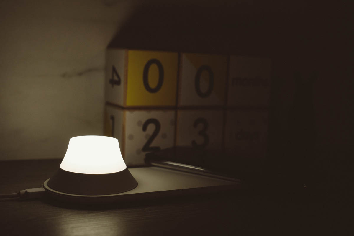 內建鋰電池就在小夜燈裡,充飽一次電約 3~4 小時,在暖黃光下使用可以達 24 小時,如果是白光模式約 11 小時。
