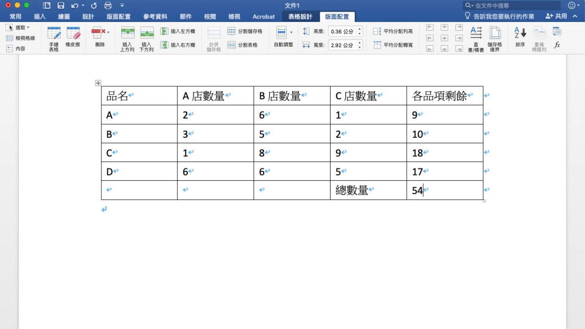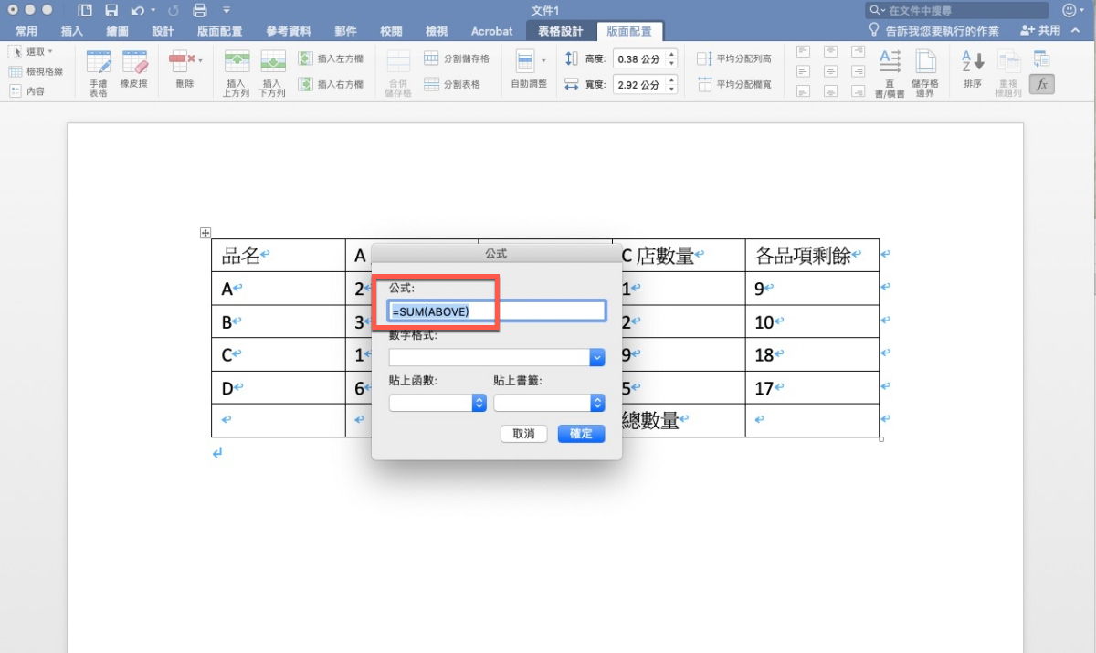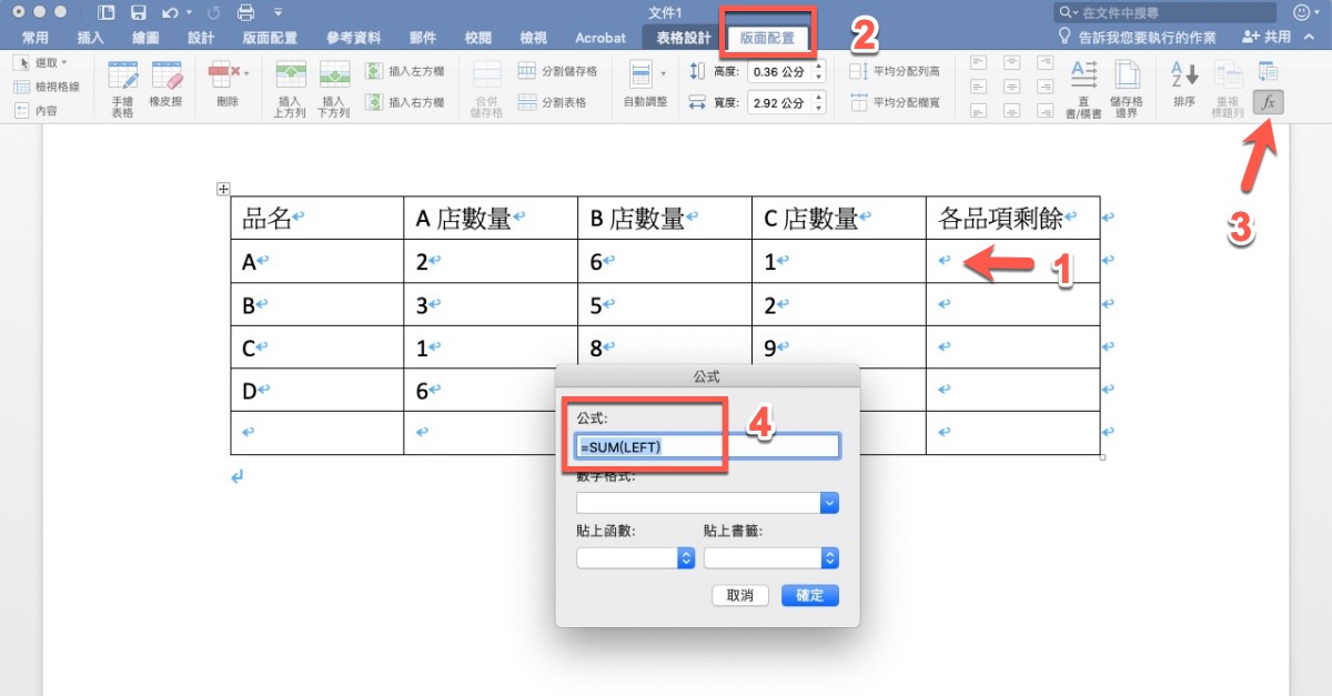 接下來教大家怎麼做,很簡單的,比如第一排要加總左邊三家店的數量,先點擊要加總的欄位,然後上方會有「版面配置」,再點擊工具列中的「fx」(也就等同 Excel 的函式),然後在公式欄位輸入「=SUM(LEFT)」,也就是將左排數字加總,如果你有小數點等需求,可以再手動選一下數字格式的部份,按下確定就完成了第一欄的加總。Word 做表格加總的缺點是,只能一欄一欄的重複這樣的動作,沒有像 Excel 一樣下拉就全搞定。