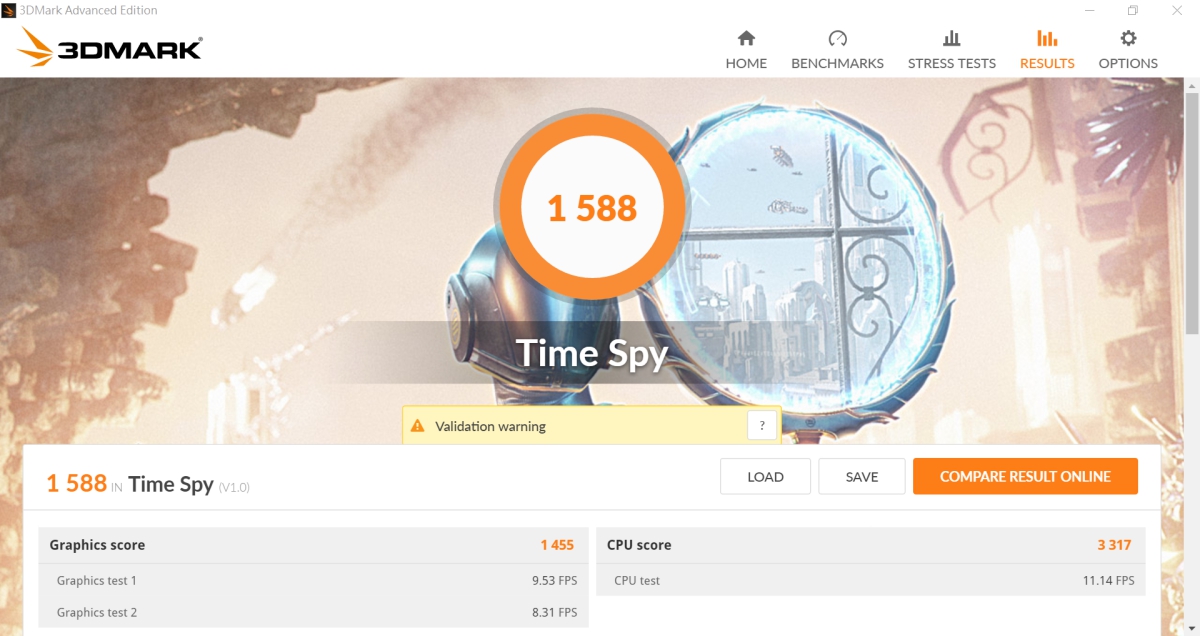 ASUS ZenBook Pro 14 搭配的獨立顯卡 NVIDIA® GeForce® 1050 Max-Q,是電競等級的顯卡,透過 3DMark 的 Time Spy 測試獲得 1,588,一般來說這樣的效能已經足以用來玩 3D 遊戲、剪輯影片或大量修圖,都會是順便沒問題。